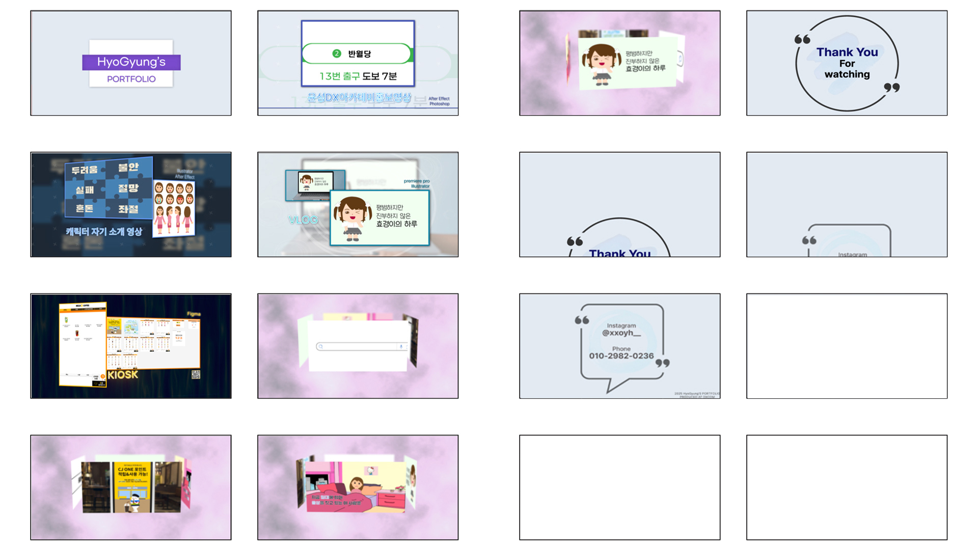 사이니지홍보영상, 캐릭터자기소개영상, vlog, 키오스크(피그마)를 작업한 내용을 정리한 영상입니다